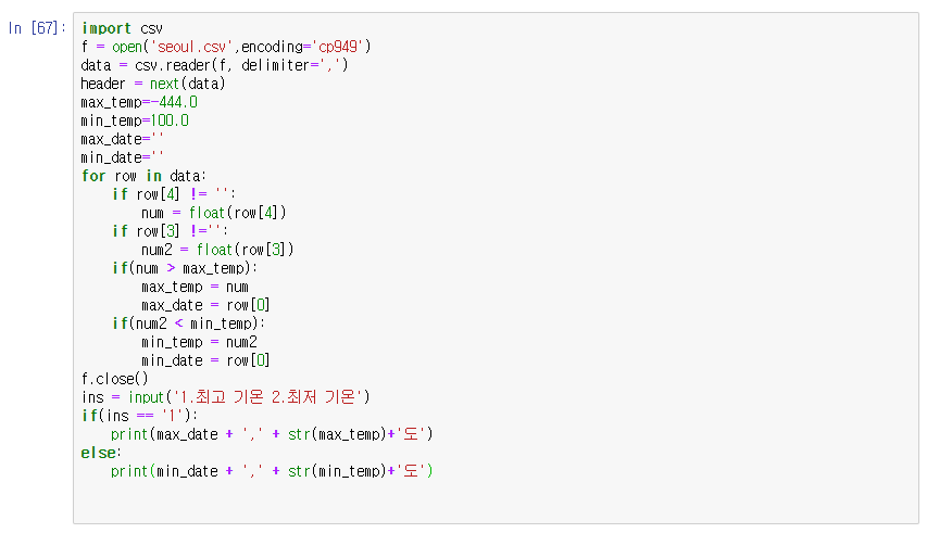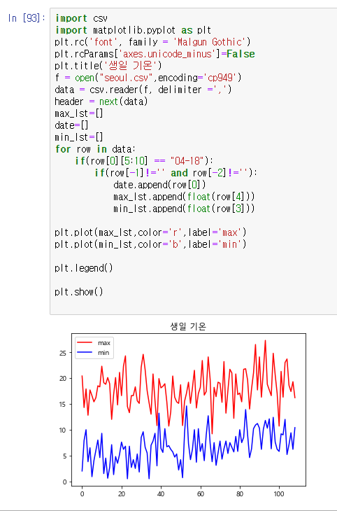 데이터 시각화를 위한 기초적이 그래프 그리기를 실습해보았다. 1. 생일 기온 그래프 관측 이래 필자의 생일(04-18)에 측정한 최고 기온과 최저 기온을 꺾은선 그래프로 나타내었다. 2. 계절별 기온 히스토그램 계절별 기온을 히스토그램으로 나나태었다. 여름은 30도 이상, 겨울은 0도 부근에 많이 분포되어 있는 것을 알 수 있다. 더불어 봄보다 가을이 좀 더 따뜻한 것으로 나타난다. 3. 월별 일교차 boxplot 2019년의 월별 일교차를 boxplot으로 나타내 보았다. 4월달의 일교차가 가장 높았던 것을 알 수 있다.